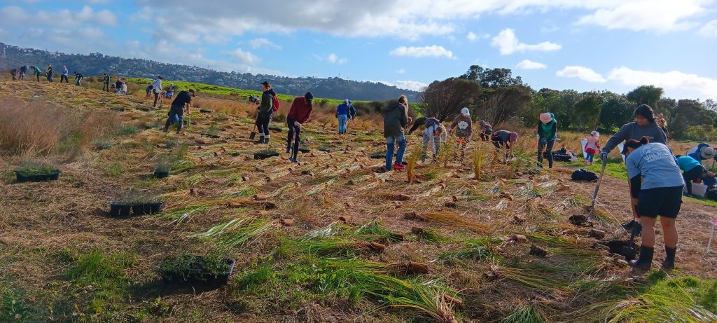 The Park Rangers provided gloves and spades, along with planting lessons. ” It felt amazing to be part of this large group who care enough about our planet to turn up and plant trees, said young volunteer Olivia. “I didn’t expect to see so many people here, all diligently digging ! I loved the description of the Pukeko Dance we should do to ensure the plant is firmly embedded in the ground”.