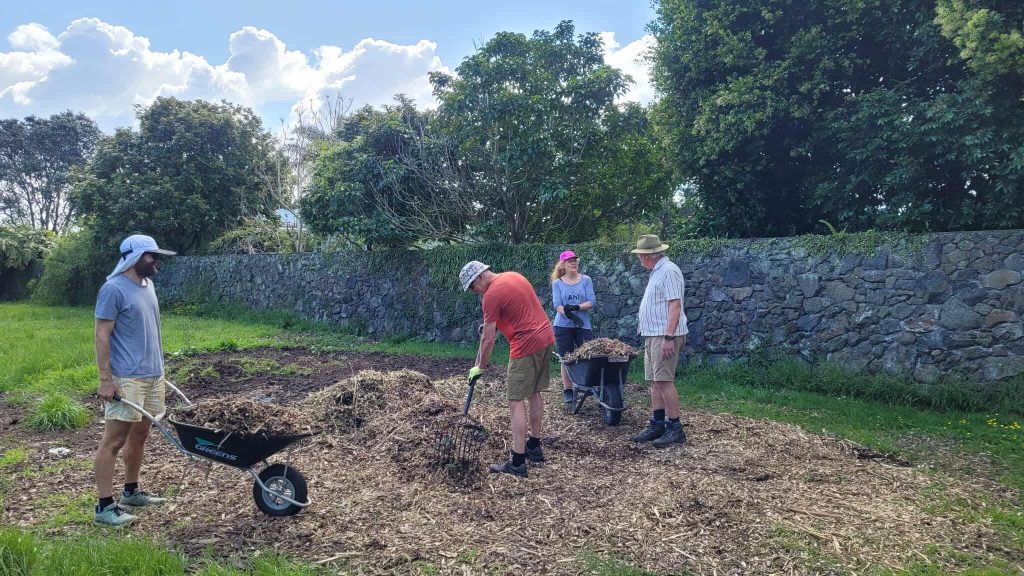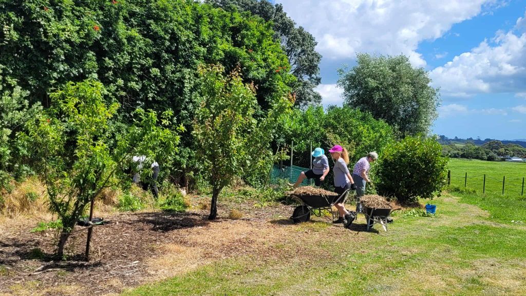 Volunteers rolled up their sleeves to care for the orchard, starting with spreading mulch around the thriving blueberry bushes and carefully weeding around the harakeke to keep the area tidy and healthy.