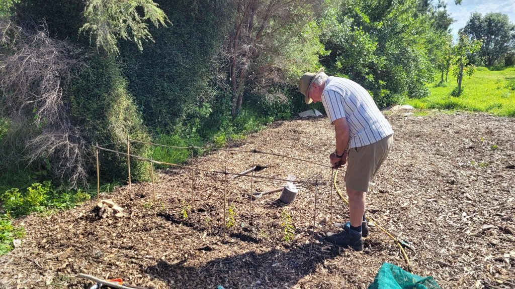 A major task of the day was transplanting young peach seedlings, giving them more space to grow strong and ready for the upcoming T-bud grafting workshop in February. To help the seedlings adjust, volunteers added shade cloth to protect them from transplant shock, overheating, and moisture loss.