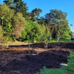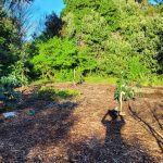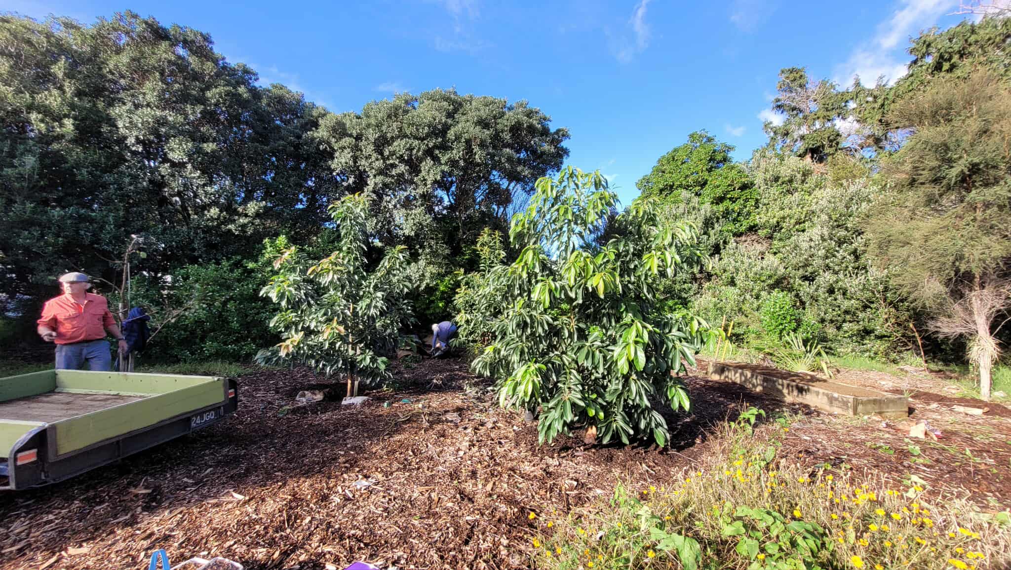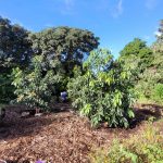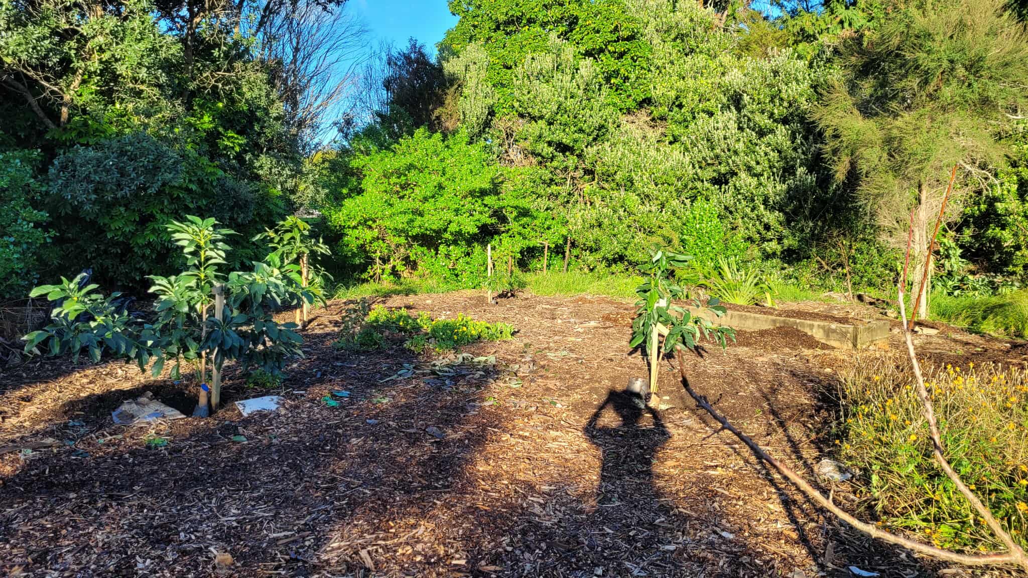 Peter was also having an observant day. He realised that the mulch around our trees was getting so close to the bottom of the trunks that it was beginning to rot away the bark. Note going forward that each tree needs a donut of space between the trunk and the mulch. It’s okay for cardboard to be in this space to reduce kikuyu growth. The volume of rain we’ve had recently may have contributed to this as when very wet, the mulch settles to an even depth (including around the base of our trees).