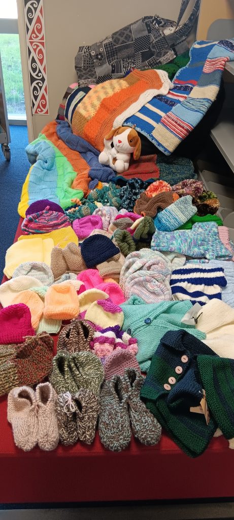The group meets weekly every Thursday from 2-4pm and monthly every third Saturday from 2-3.45 pm, in the Māngere Bridge Library.  All are welcome to join in – you will likely see some of our regular Foffers (Friends of the Farm members ☺).  People can knit or crochet their own projects or produce items for local charities.